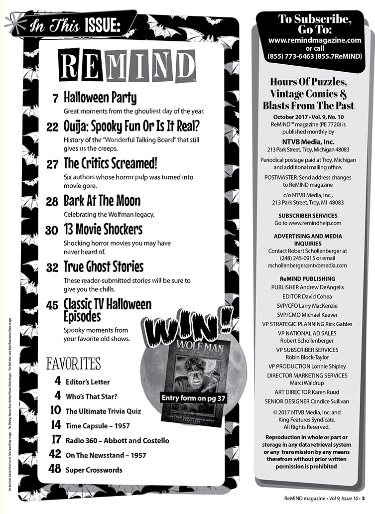 Have a howling good time with this spooky issue dedicated to hair-raising horrors in TV and film. The Wolf Man's Lon Chaney Jr. graces our cover, and two glossy pages pay tribute to other werewolf works that packed a bite. Plus, we check in with Hitchcock ingenue Tippi Hedron and horror hottie Elvira.